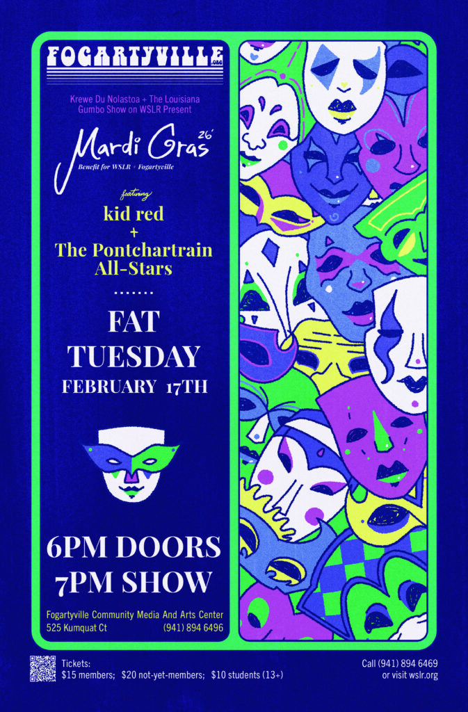 Join WSLR’s own kid red (Louisiana Gumbo) and The Pontchartrain All-Stars for the annual Mardi Gras bash benefiting WSLR+Fogartyville.