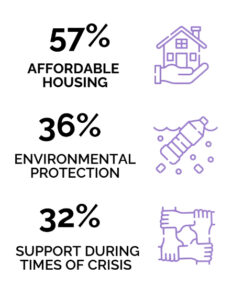 The third-biggest concern is providing help to people in need. 32% of respondents picked help for people struggling with hunger, mental health or homelessness as their top concern. As with affordable housing, it’s mostly concern for others.
