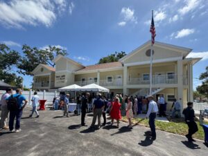 Johannes Werner: That was the sound of a bit of relief from the affordable housing crisis in Sarasota on a hot late-April morning. The occasion was a ribbon cutting for Heroes’ Village, a two-story rental complex that will be managed by a subsidiary of the Society of St. Vincent de Paul, the international Catholic charity. The complex is designed to house veterans and their families in 10 two-bedroom apartments that can be split between roommates or be used by families, and the rents are expected to be affordable for veterans who make 80 percent of the area median household income. That’s roughly $51,000.