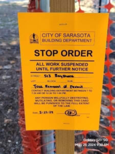 A City of Sarasota Building Department stop order for the removal of trees without a permit issued May 2024.