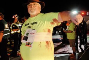 Vicky Hall: It’s kind of a fun thing to do, and to be out on the runway in a place you’d never get to go before. And also, to see what happens when they have a disaster. I’ve been a nurse and an EMT for a long time. Hopefully an airline crash won’t happen at the airport. But we know they do, and they need to know what’s gonna happen before it really does. They need to be able to practice.