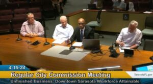 Steve Horn, Ian Black, Marlon Brown and Chris Gallagher (of Hoyt Architects) answered questions from city commissioners during the April 15, 2024, meeting. The City Commission unanimously voted to move forward with buying the 1st Street properties after the discussion. Image from City of Sarasota video via Suncoast Searchlight