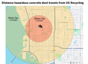 Map depicting the reach of dust emissions from the US Recycling plant. | Courtesy CCNA